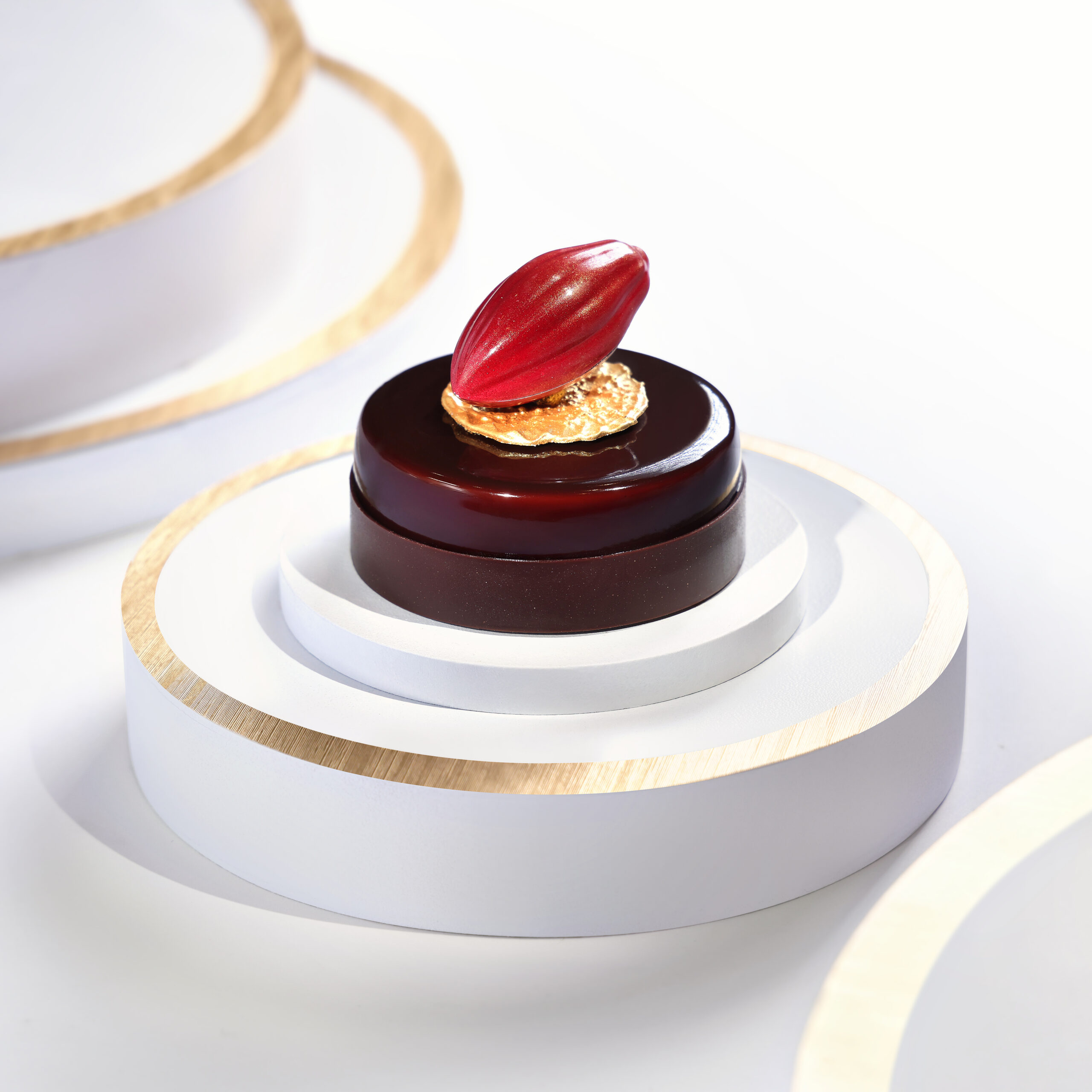 選用法國70%朱古力豆製作,光滑誘人的朱古力外層包裹著Valrhona朱古力海綿蛋糕、Valrhona及Cocoa Barry打造的朱古力慕絲及榛子脆脆,微苦的黑朱古力與香甜的雲呢嗱忌廉完美融合於整個蛋糕中,平衡了朱古力的苦澀與甜美,一入口即被甘濃香氣縈繞,餘韻綿延,帶來極致朱古力感官享受,是朱古力愛好者的不二之選! 表面綴以一大顆立體的手製朱古力豆,維肖維妙。
